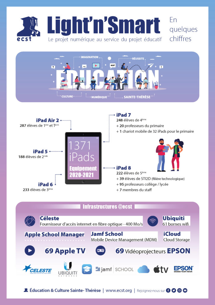 Notre projet Light ’n’ Smart qui lie les personnels ECST, les parents d’élèves et nos apprenants, maintenant en place depuis 7 ans, autour de l’introduction du numérique dans le quotidien de nos élèves en est un formidable révélateur. Chacun de nos élèves, à partir de la classe de 5ème est équipé d’un iPad pédagogique.