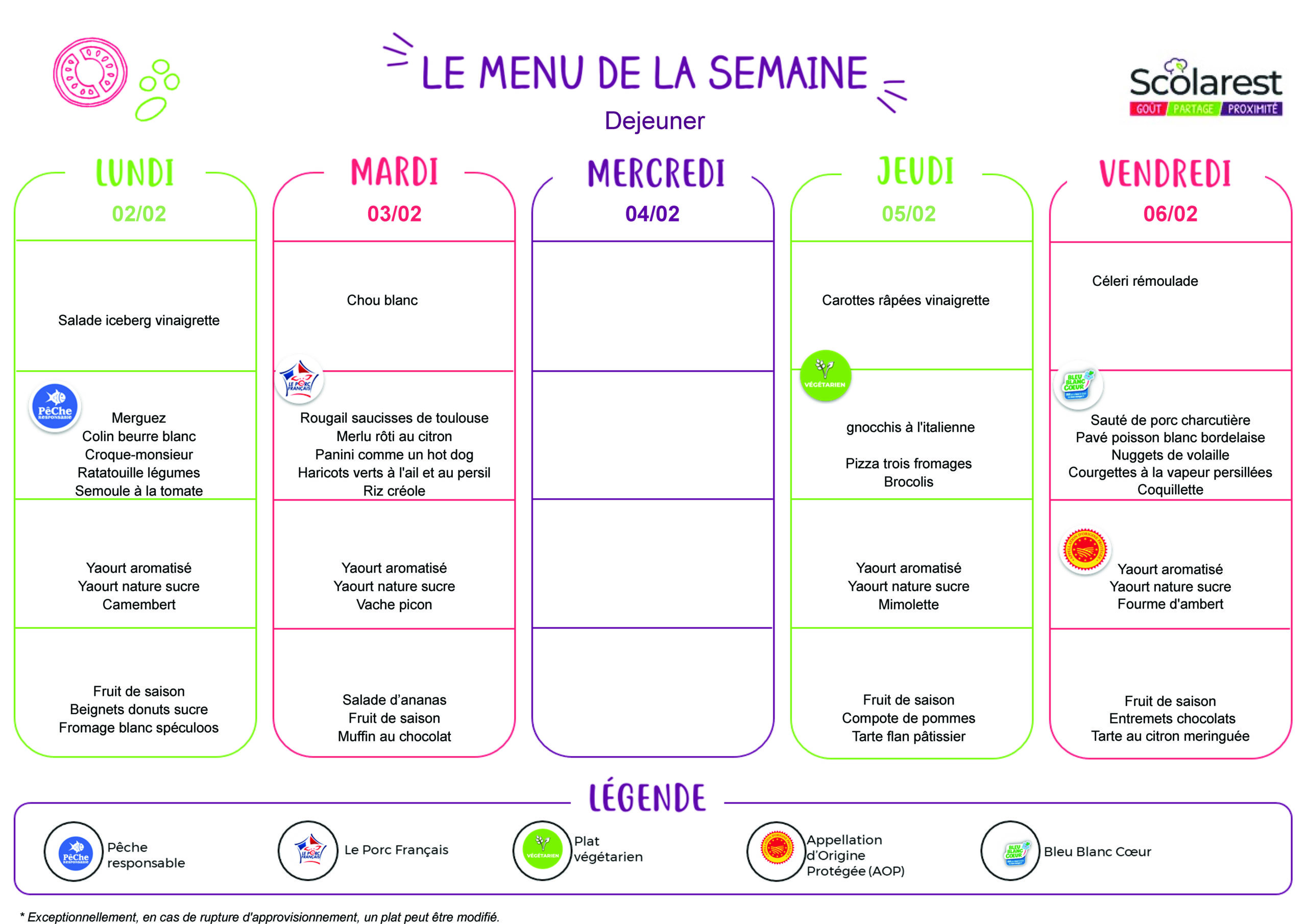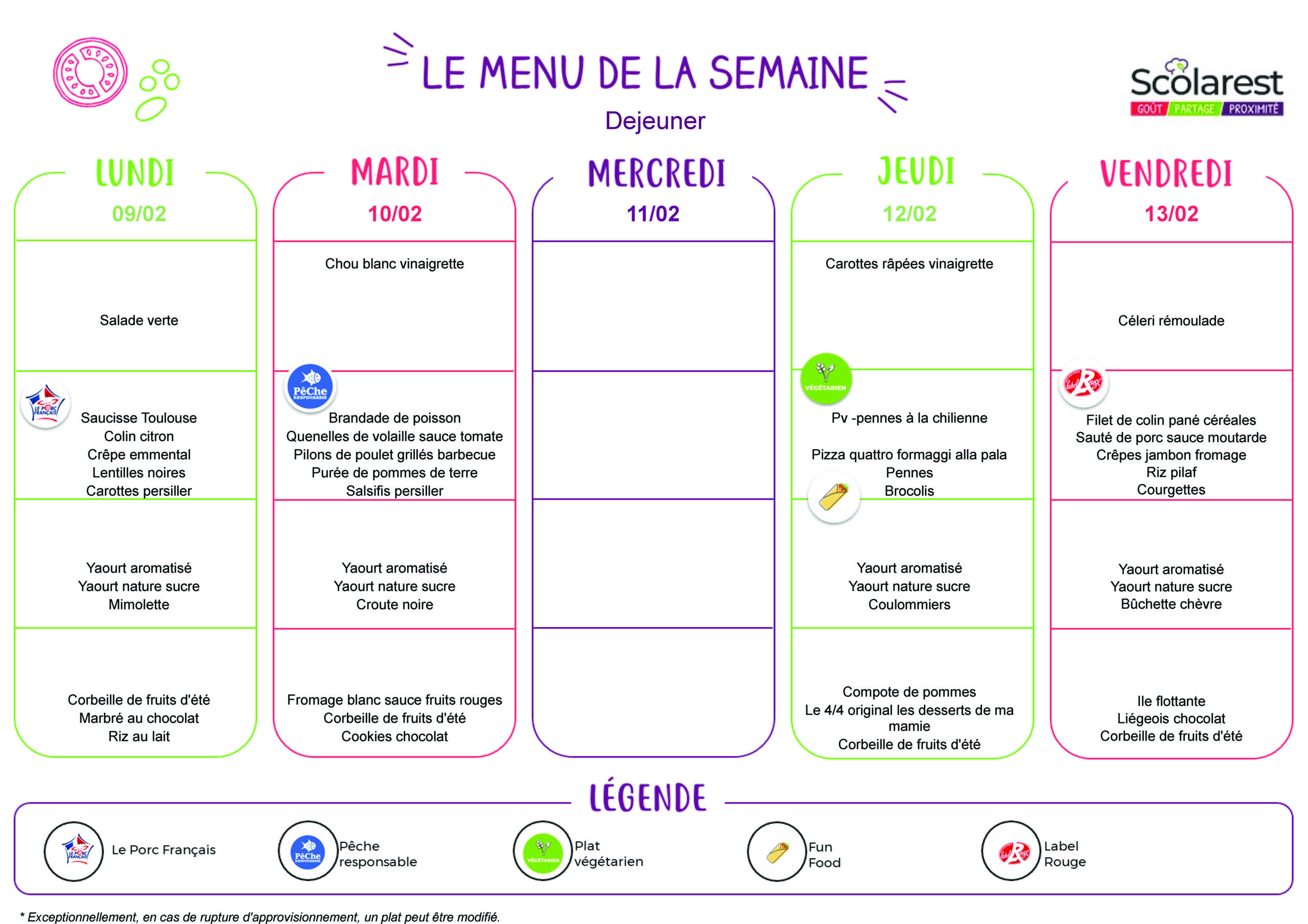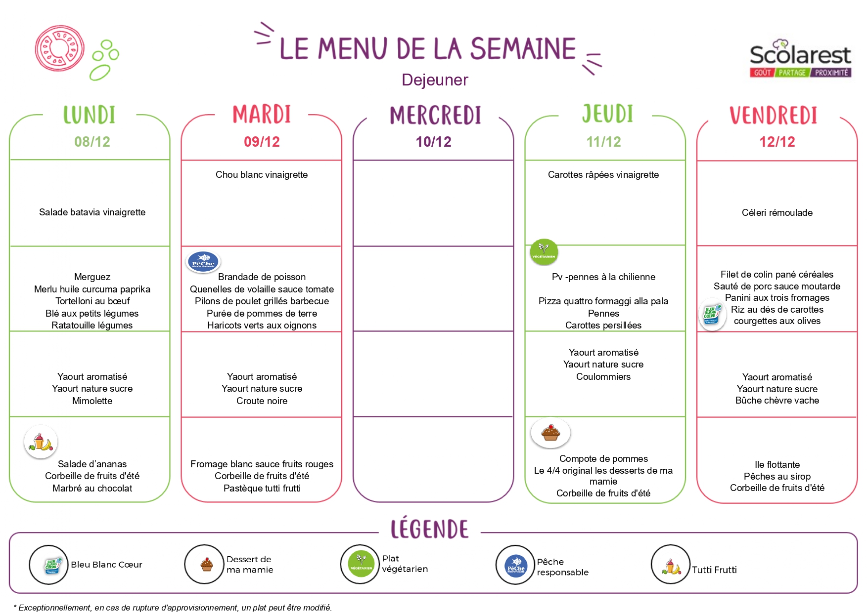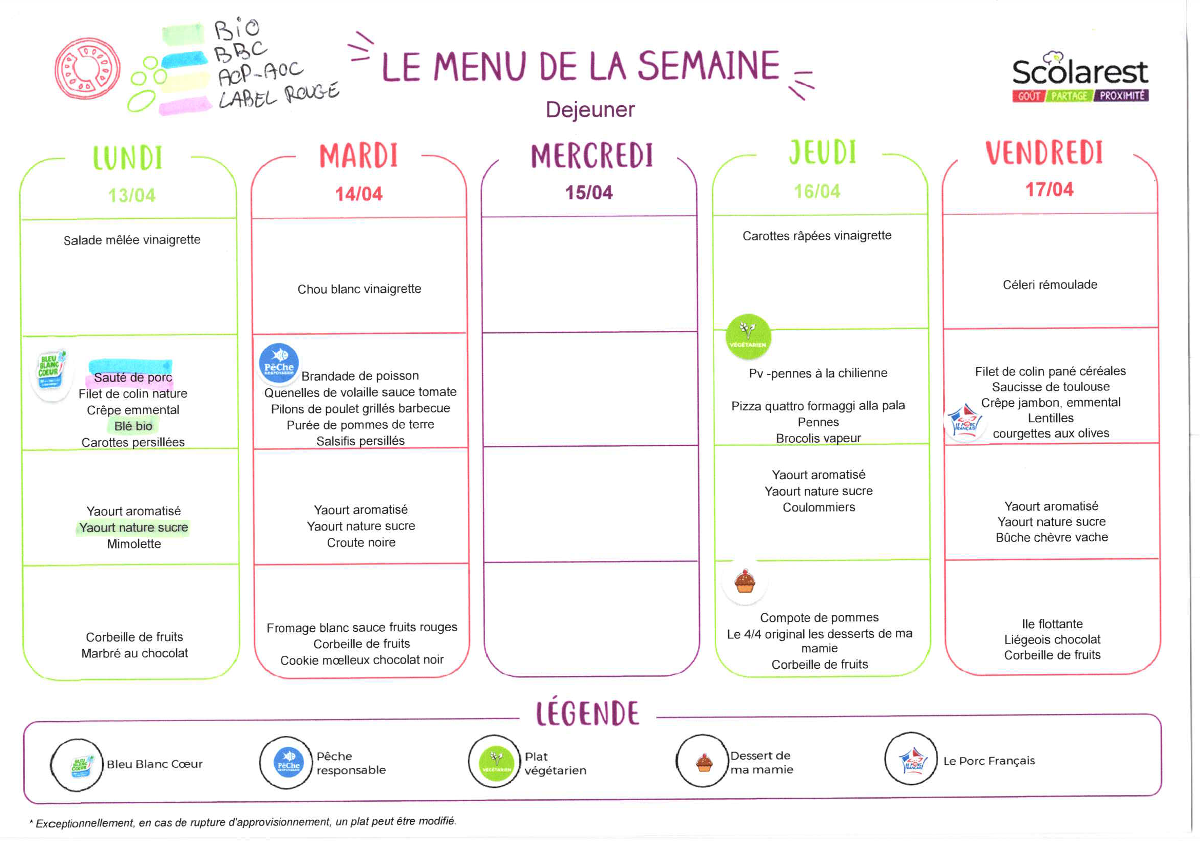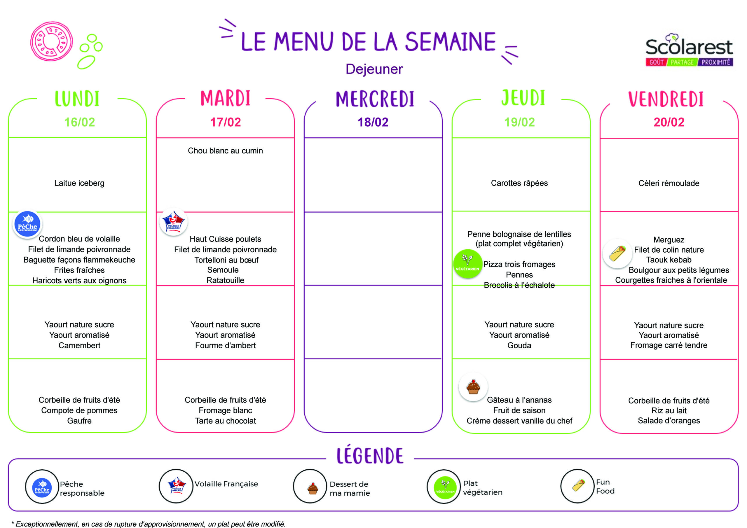 En cas de vacances anticipées pour cause d’examens (le calendrier n’étant pas connu à ce jour), de voyage ou sortie scolaire, ou de modification de l’emploi du temps de notre fait qui impliquerait une sortie exceptionnelle avant la prise du repas ou une entrée à 13h30, les coûts des repas non consommés feront l’objet d’un avoir en votre faveur.