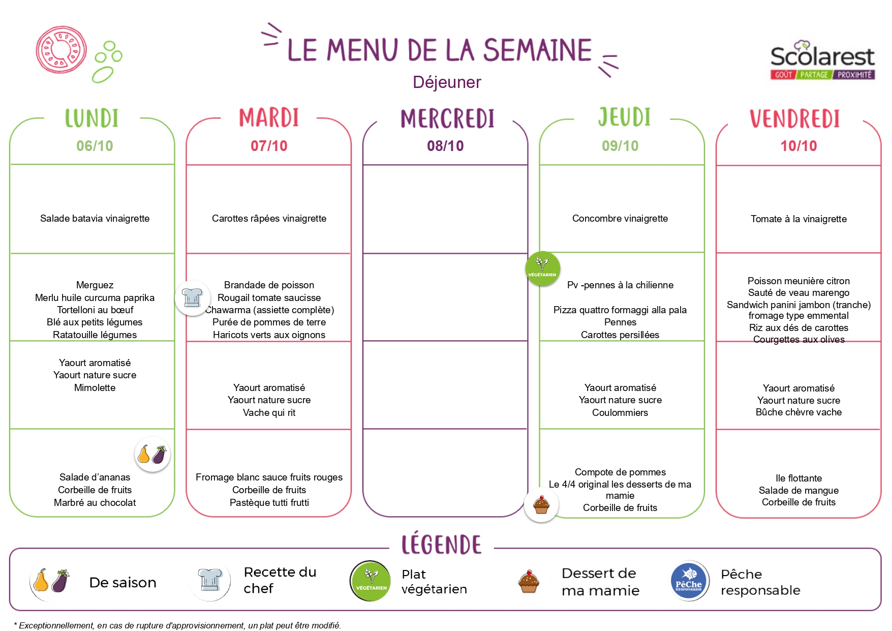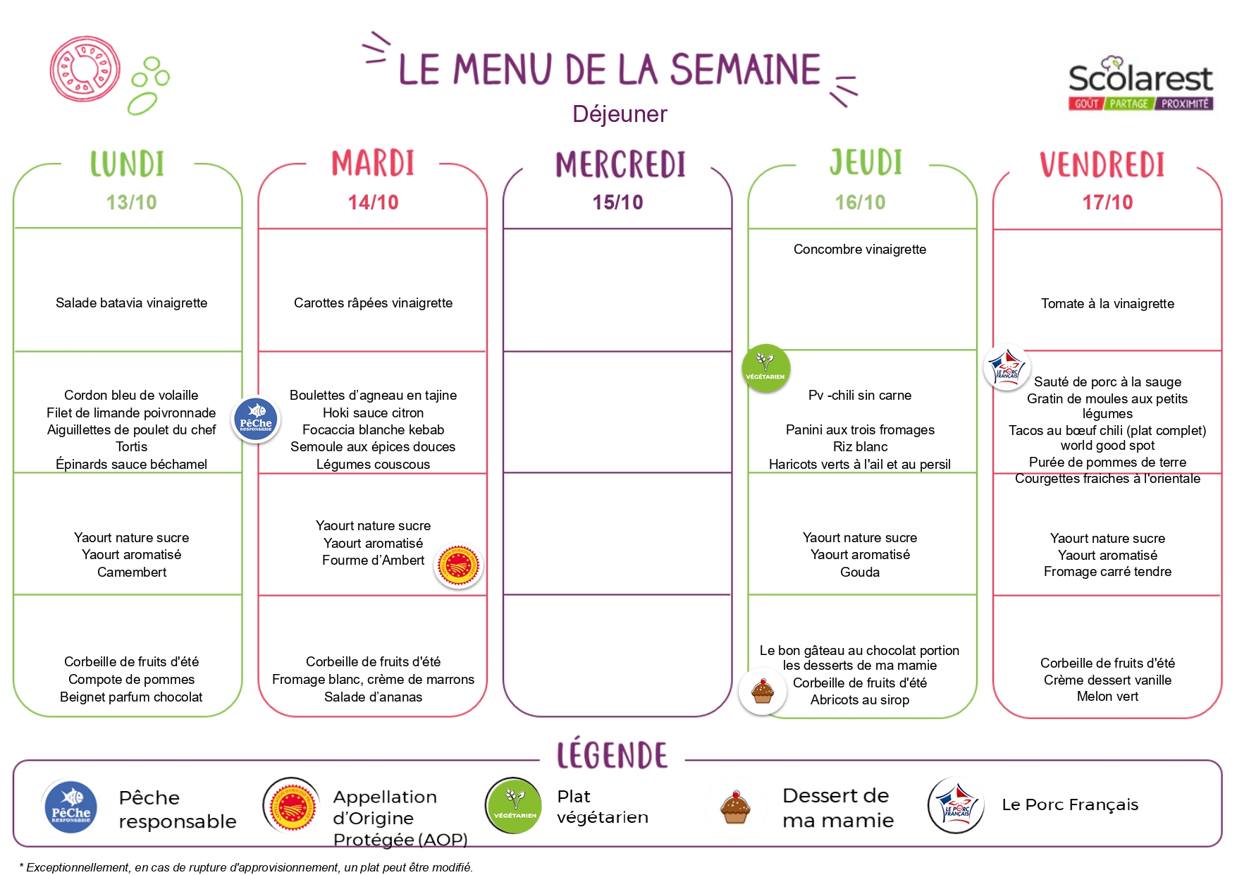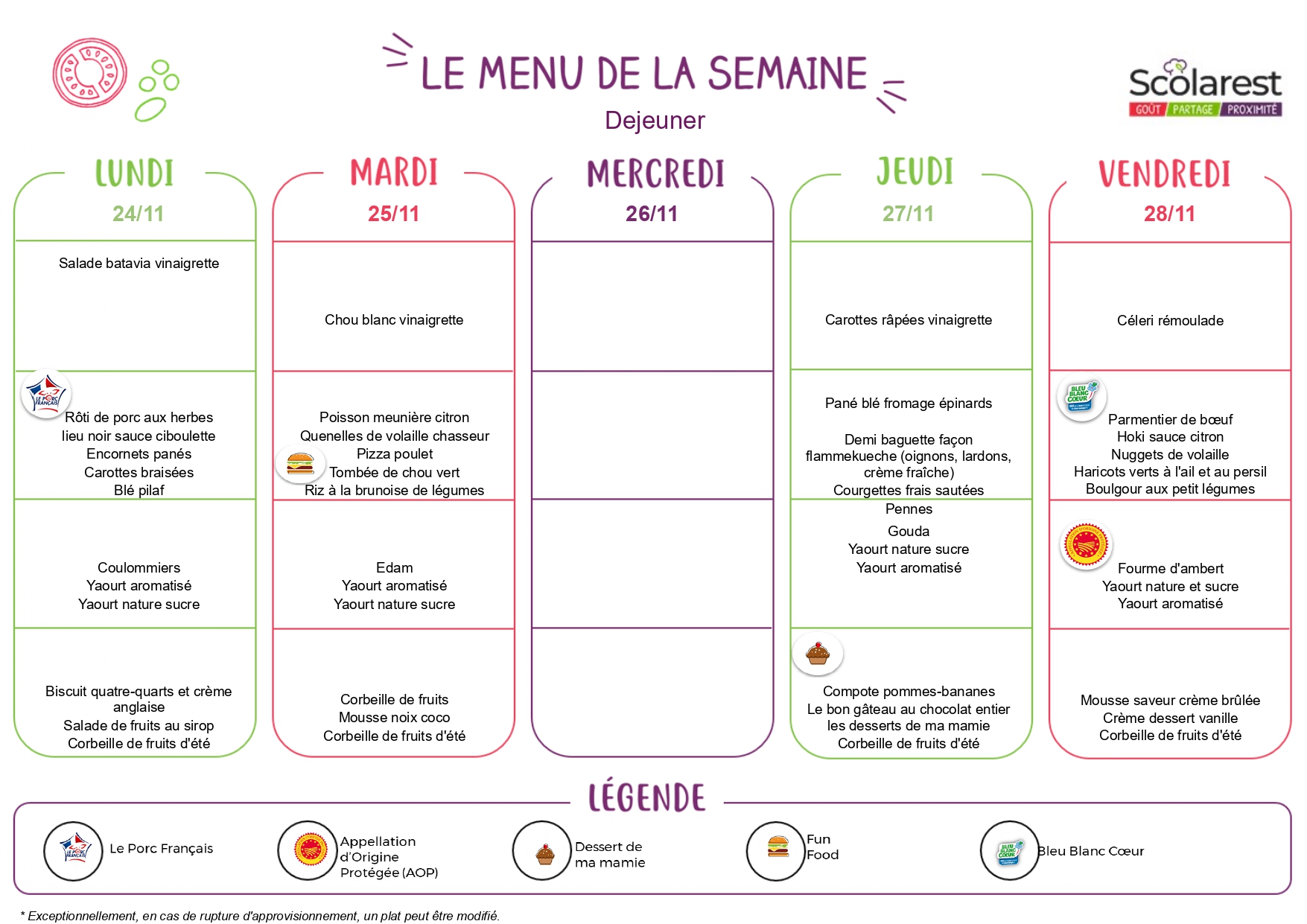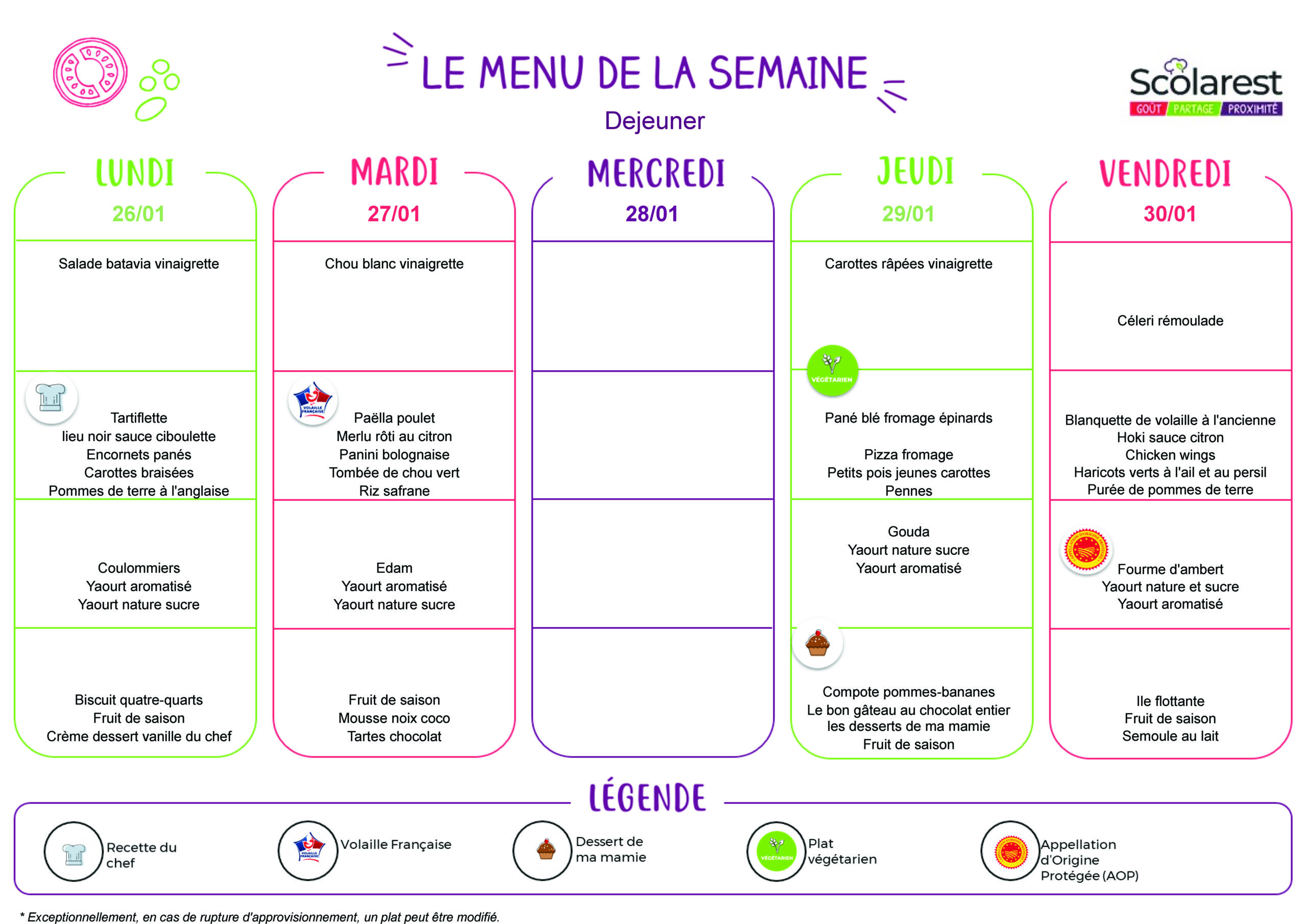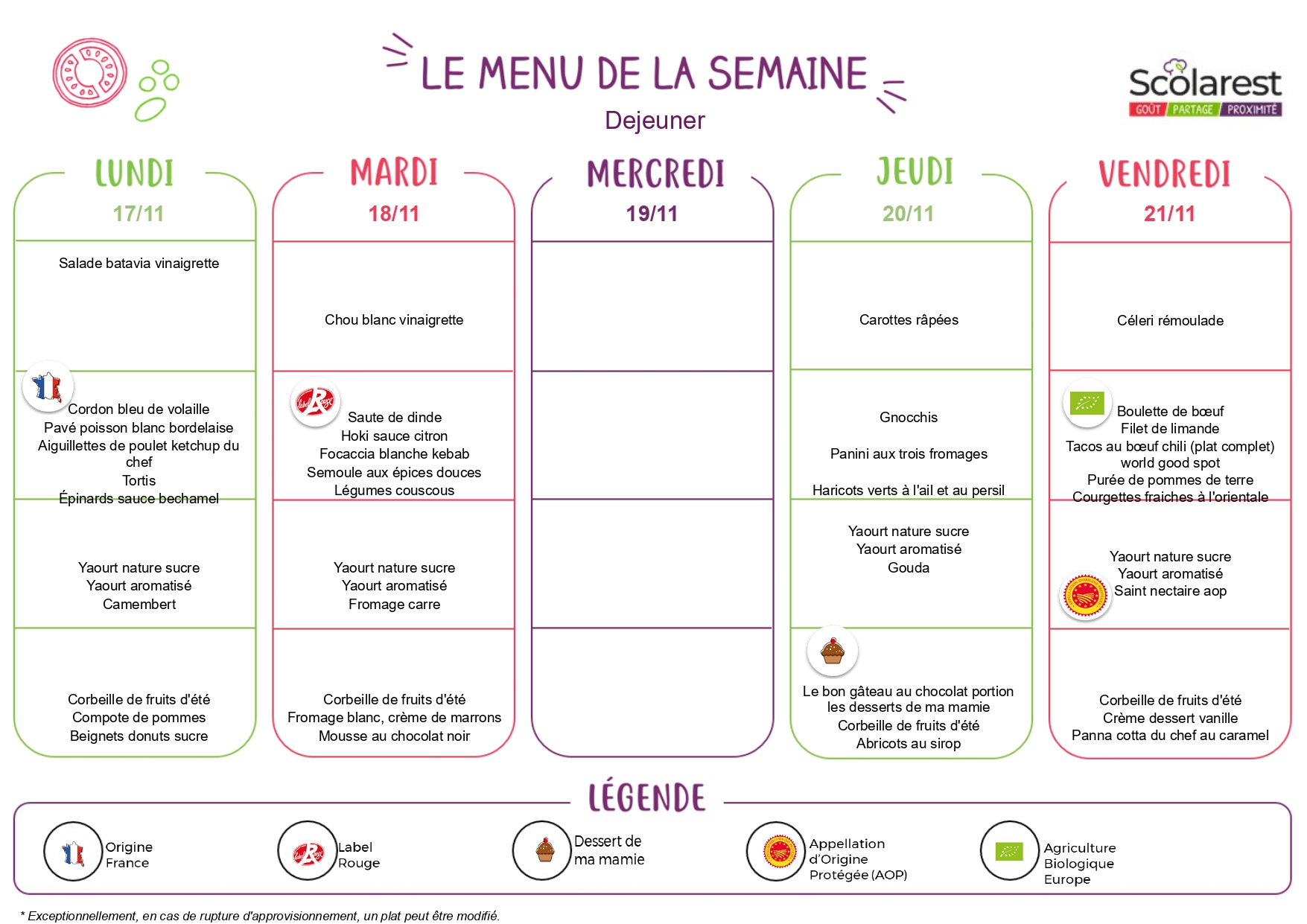 En cas de vacances anticipées pour cause d’examens (le calendrier n’étant pas connu à ce jour), de voyage ou sortie scolaire, ou de modification de l’emploi du temps de notre fait qui impliquerait une sortie exceptionnelle avant la prise du repas ou une entrée à 13h30, les coûts des repas non consommés feront l’objet d’un avoir en votre faveur.